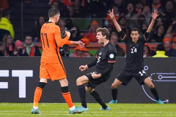 夙敌之间的交手,荷兰与德国1比1握手言和,穆勒与贝尔温为两队各进一球。德国电视一台嘉宾施魏因斯泰格说:“对于两支正处在重建中的球队来说,两队都收获了信心。”弗利克开局8连胜的纪录被终结,不过他表示对此并不是很在意。英格兰主裁的一次点球判罚,在赛后引起了不小的争议。